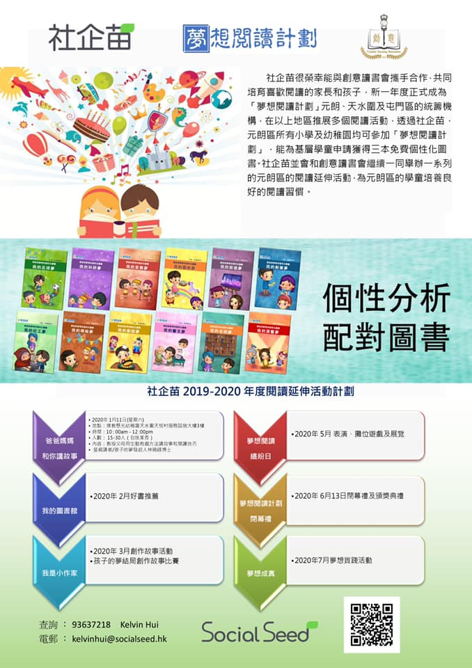 社企苗於2019-2020年度,正式成為夢想閲讀計劃元朗、屯門和天水圍區的統籌機構,以上是本年度的活動計劃,誠邀各機構和學校踴躍參加。