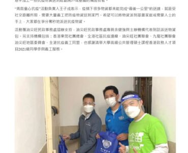 香港駿青會與社企苗主辦,油尖旺民政事務處協辦,集合青年的力量在油尖旺區的舊式大廈,上門派發抗疫物資包,物資包括...